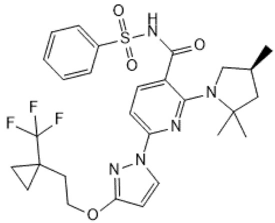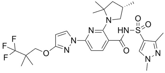Two phase 2, double-blind RCTs tested safety and efficacy of triple combination of VX-440 (NCT02951182) or VX-152 (NCT02951195) with Ivacaftor and Tezacaftor in adult F/MF patients and showed a mean increase in ppFEV1 of 12% and 9.7%, respectively [61,62,63,64]. Furthermore, F/F patients who had already been treated with Ivacaftor and Tezacaftor experienced a 7.3% and 9.5% increase in ppFEV1 after addition of VX-152 or VX-440, respectively. VX-445 (Elexacaftor, Figure 6) and VX-659 (Bamocaftor, Figure 7) were selected for subsequent clinical studies because of their pharmacological properties and long-term safety profiles [61,62,63,64].