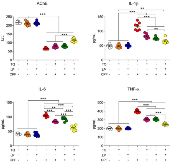 4.5. Assessment of Serum AchE Activity and Proinflammatory Biomarkers