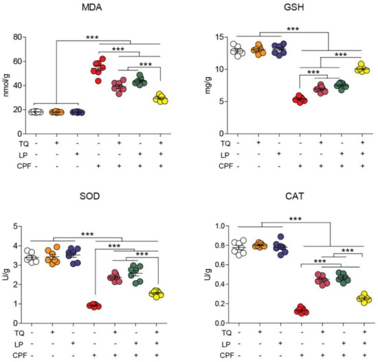 - Abdel-Daim, M.M.; Abushouk, A.I.; Bungău, S.G.; Bin-Jumah, M.; El-Kott, A.F.; Shati, A.A.; Aleya, L.; Alkahtani, S. Protective effects of thymoquinone and diallyl sulphide against malathion-induced toxicity in rats. Environ. Sci. Pollut. Res. 2020, 27, 10228–10235. [Google Scholar] [CrossRef]