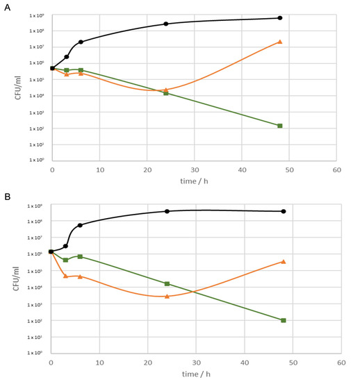 Growth inhibition by Ci_SFEopt and Ci_SFEpur at a concentration of 5 mg/mL against (A) S. aureus, and (B) S. aureus MRSA. Green, Ci_SFEpur; orange, Ci_SFEopt, black, microbial control.