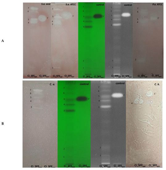 Bioautographic assay of Ci_SFEopt and Ci_SFEpur developed in 85:15 (v/v) dichloromethane:methanol as the solvent. (A) Antibacterial activity against Staphylococcus aureus (oral isolate), S. aureus ATCC (left); and Pseudomonas aeruginosa (right). (B) Antifungal activity against Candida albicans (left) and C. krusei (right). Spots on different Rf values: 1. Rf = 0.18 (activity only against S. aureus ATCC); 2. Rf = 0.20 (activity only against P. aeruginosa); 3. Rf = 0.65 (activity against S. aureus ATCC and C. albicans); 4. Rf = 0.71 (activity against all tested bacteria and fungi); 5. Rf = 0.76 (activity against all tested bacteria and fungi, except C. krusei); 6. Rf = 0.82 (activity against all tested microorganisms, except P. aeruginosa and C. krusei); 7. Rf = 0.88 (activity against all tested bacteria and fungi, except C. krusei).