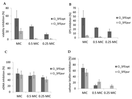 The extracts Ci_SFEopt and Ci_SFEpur differ in the active compound spectra, which may result in the more profound antibiofilm effects in the cases of Figure 4A,B, i.e., putative synergistic action of higher number of active compounds may play a role, whereas in the case of biofilm eDNA (Figure 4C) inhibition by only purified fraction compounds are sufficient to perform the action. Accordingly, antibiofilm activity is not strongly correlated with eDNA. eDNA inhibition is one of the many mechanisms to reduce integrity of the biofilm structure and is one of the causes of biofilm resistance to antimicrobials. It is not surprising that both extracts exhibited the similar action on eDNA inhibition, although Ci_SFEopt had more pronounced antibiofilm activity.