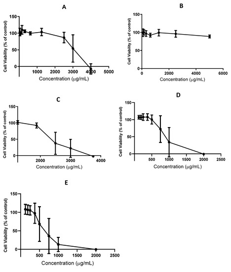 Cytotoxic profile of chicory extracts in Caco-2 cells after incubation for 4 h. (A) Wit_EtOAc. (B) Wit_H2O. (C) Ci_EtOAc. (D) Ci_SFEopt. (E) Ci_SFEpur. Results are presented as mean (±stdev) of three independent experiments.