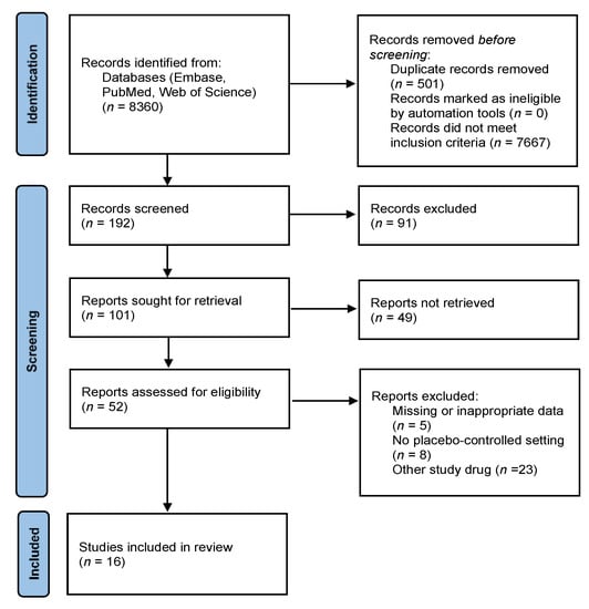 By using the search terms dronabinol and nabilone for the literature search of the EMBASE, PubMed and Web of Science databases and the Cochrane Central Register of Controlled Trials, removing duplicates, the search yielded a total of 7859 potentially relevant reports. The included RCTs were selected according to the flow chart presented in Figure 1. After screening titles, 192 publications remained, and by further screening abstracts, 101 hits were retrieved for full-text screening, of which 85 RCTs were also excluded. The reasons for excluding articles are listed in Supplementary Table S2. Briefly, 26 papers were excluded since these did not report clinical trials, 22 trials were not placebo-controlled, 15 were excluded due to missing or inappropriate data, whereas in 22 trials other study drugs were used than nabilone or dronabinol. A total of 19 RCTs were considered to be appropriate for quantitative analysis [7,8,9,10,11,12,13,14,15,16,17,18,19,20,21,22,23,24,25], and 16 of these were included in the meta-analysis. Although three studies were considered for inclusion, the criterion of the minimal number of studies with the same outcome was not fulfilled in any of the outcomes reported; therefore, these were excluded from the meta-analysis. In 6 studies, nabilone was the study drug (Table 1) [11,13,15,18,22,23], whereas in 10 studies (Table 2) [7,8,9,10,12,16,17,19,21,25], dronabinol was used.