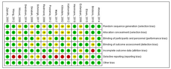The risk of bias was assessed using the Cochrane Collaboration tool, which includes seven specific domains: random sequence generation, allocation concealment, blinding of participants and personnel, blinding of outcome assessment, incomplete outcome data, selective reporting and other scores of bias. For each domain, studies were judged to have either high (red), unclear (yellow) or low (green) risk of bias. Disagreements in quality of studies were resolved by discussion. A risk of bias summary table and figure were generated by the RevMan 5 software [32].