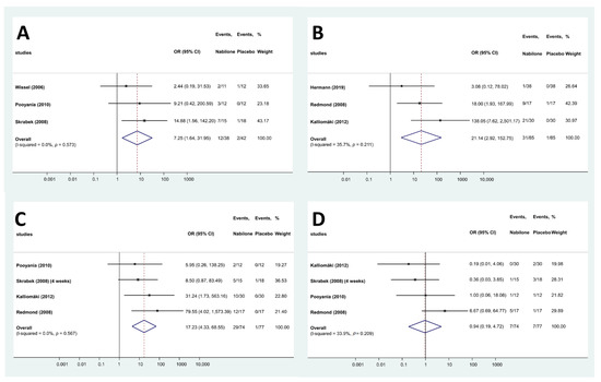Forest plots of different AEs—nabilone ((A): drowsiness; (B): dizziness; (C): dry mouth; (D): headache).