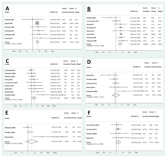 Forest plots of different AEs—dronabinol. ((A): dry mouth; (B): dizziness; (C): headache; (D): nausea; (E): drowsiness; (F): fatigue).
