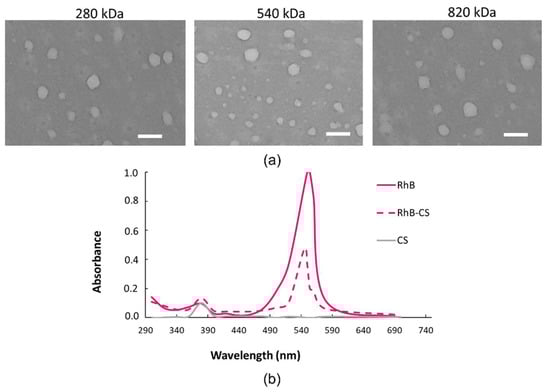 (a) TEM images of HA/CS NPs made of 280 kDa, 540 kDa or 820 kDa HA (scale bar = 400 nm); (b) UV-vis spectra scanned from 200 nm to 700 nm of CS-RhB conjugate (red dashed line), RhB (red full line) and CS (grey line).