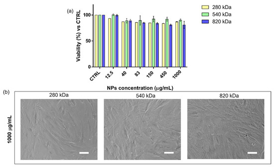(a) Cytotoxicity results obtained by the incubation (24 h) of hMSCs with increasing concentration of HA/CS NPs (12.5–1000 μg/mL). Different HA Mws were used, 280 kDa (yellow bar), 540 kDa (green bar) and 820 kDa (blue bar). The graph represents the cell viability percentage compared with that of untreated cells (CTRL). (b) Optical microscope images of hMSCs treated for 24 h with 1000 μg/mL of HA/CS NPs (scale bar = 50 μm).