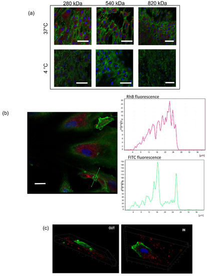 To evaluate the interplay between the HA Mw and the binding and uptake of the HA/CS-RhB NPs and whether NPs uptake follows an active or passive process, the hMSCs were incubated at 37 °C or 4 °C for 90 min with 100 μg/mL of fluorescent HA/CS-RhB NPs. This time point was chosen from our previous results and based on evidence found in literature, where it is shown that the HA-based NPs’ uptake reached a plateau already at 2 h of incubation for several cell models [26,30].