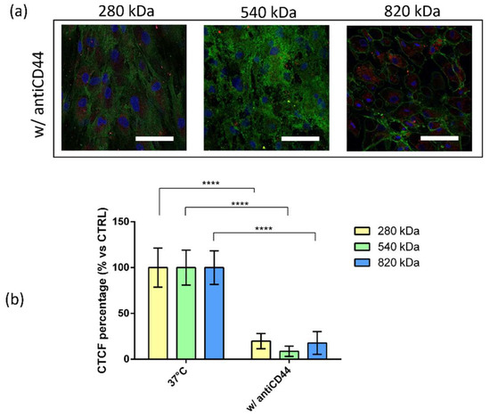 To evaluate whether the CD44–HA interaction plays a role in the NP uptake, competitive binding experiments were performed by pre-treating hMSCs with mouse anti-CD44 glycoprotein primary antibody (antiCD44) and enabling them to prevent HA binding to CD44 and thereby NPs internalization. As can be noted from Figure 6, the incubation with antiCD44 notably reduced the NPs cell internalization; a cellular uptake inhibition of 80.2%, 91.6% and 82.3% was reached by using HA/CS-RhB NPs prepared with HA of 280 kDa, 540 kDa and 820 kDa, respectively. After the pre-treatment with antiCD44, the fluorescence level inside the cells was almost negligible, and no differences were highlighted among the different HA Mws. These results prove that the internalization of HA/CS NPs into hMSCs primarily occurs by a specific interaction with CD44 regardless of the HA Mw used.