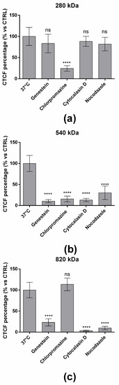 The results are shown in Figure 7a. The uptake of the HA/CS NPs made of HA with a Mw of 280 kDa was dramatically reduced by pre-treating cells with Chlorpromazine hydrochloride if compared with untreated cells cultured at 37 °C (p value < 0.0001, Figure 4a). Instead, no statical differences were revealed when cells were treated with other inhibitors.
