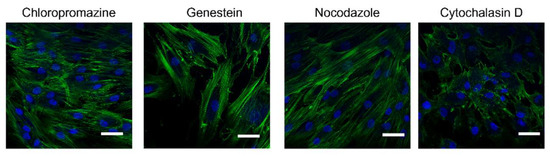 Confocal microscopy images of hMSCs showing the F-actin filaments morphology after treatment with each one of the inhibitors (Chlorpromazine, Genistein, Nocodazole, Cytochalasin D) for 30 min. Nuclei were stained by Hoechst33258 and appear blue, F-Actin was stained with FITC-phalloidin and appears green (scale bar = 20 μm).