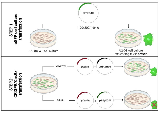 A study was carried out in which a CRISPR/CasRx system, based on previous research [8], was designed for the degradation of target RNA, and through which we analysed the effectiveness in the degradation of green fluorescent protein (eGFP) mRNA in U-2 OS cells (ATCC® HTB-96™, Manassas, VA, USA).