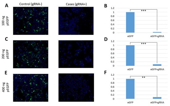 Representative fluorescence microscopy images of the cultures with gRNA (case situations) and without gRNA (control situations) (10X). From top to bottom—each row represents the different concentrations of the transfected plasmid pEGFP-C1: (A) 100 ng; (C) 200 ng; and (E) 400 ng. From left to right—each column represents the different situations for each condition. The first column represents the control situation without gRNA transfection and the second column represents the cell line transfected with gRNA. Each image represents a combination of two images taken at an excitation of 489 nm to allow the visualisation of eGFP fluorescence, and at 350 nm to allow the visualisation of the Hoechst dye. Exposures of 100 ms for green fluorescence and 10 ms for blue fluorescence were used. The statistical analyses of the normalised mean eGFP fluorescence in control and case situations for each pEGFP-C1 concentration: (B) 100 ng; (D) 200 ng; and (F) 400 ng. A two-sided t test with unequal variance and significance was used, indicated as: ** p ≤ 0.01, and *** p ≤ 0.001.