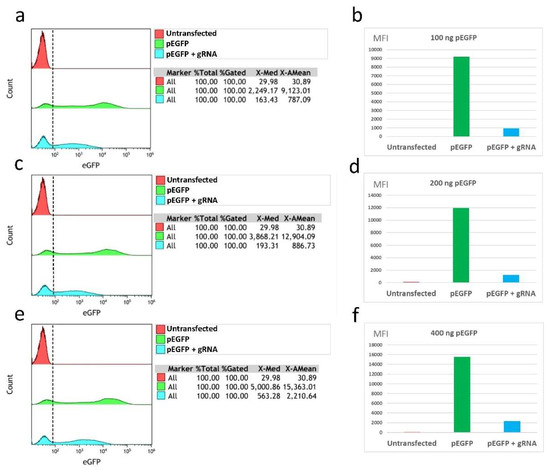 The analysis of eGFP fluorescence reduction by flow cytometry showed that the mean fluorescence intensity (MFI) for the three triplicates was reduced in all case conditions with respect to their corresponding control conditions. A reduction of 89.1% (CI95%; 84.3–91.6) (8245.5 MFI units) for 100 ng conditions was observed, as well as a reduction of 89.8% (CI95%; 87.1–93.1) (10,687.2 MFI units) for 200 ng conditions, and a reduction of 85.8% (CI95%; 84.4–87.4) (13,247.23 MFI units) for 400 ng conditions (Figure 3).