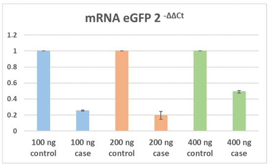 Normalised data for the relative expression of eGFP mRNA obtained by qRT-PCR; representative data for n = 3. The values for the transfection of the 100 ng case condition compared to the 100 ng control condition are represented in blue; the values for the transfection of the 200 ng case condition compared to the 200 ng control condition are represented in orange; and the values for the transfection of the 400 ng case condition compared to the 400 ng control condition are represented in green. The standard media error is also shown.