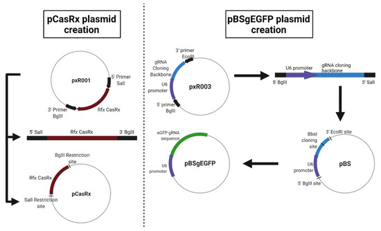 Schematic representation for the construction of each newly created plasmid. Created with Biorender.com. (accessed on 24 August 2021).