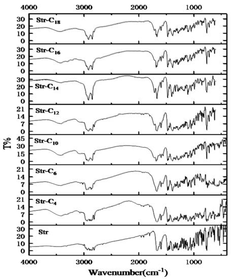 The Str ion-pair compounds were also confirmed by FTIR spectra [13,14], as shown in Figure 3. In general, the stretching vibration of the C=O group (υ C=O) of the saturated fatty acids ranged from 1714 cm−1 to 1689 cm−1, whereas the υ C=O of the Str was 1670 cm−1. When the Str reacted with the fatty acids, the υ C=O of C10, C12, C14, C16 and C18 were blue-shifted to 1722 cm−1~1716 cm−1. Compared with the υ C=O of Str, the υ C=O of C4 and C6 overlapped with the υ C=O of the Str, and a broad υ C=O absorption peak appeared. Moreover, the FTIR spectroscopy of the Str ion-pair compounds showed a new peak of 1567 cm−1~1556 cm−1, which was attributed to the absorption band of the COO− group (ν COO−) between the –COOH of the fatty acids and N of the Str. Therefore, the proof of the formation of Str ion-pair compounds was also provided by the results of the FTIR spectroscopy.