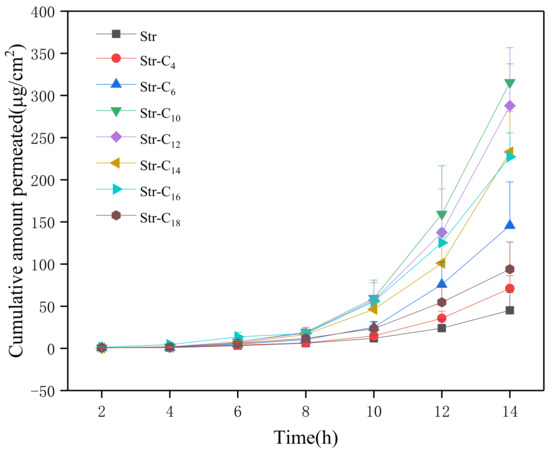 As presented in Table 2 and Figure 4, the in vitro permeation fluxes of all Str ion-pair compounds were clearly promoted, and the 24 h cumulative amounts (Q24h) of the Str ion-pair compounds were 1.5–7.8-folds greater than that of the Str. The Str-C10 had the most significant enhancing effect, with Q24 of 857.54 ± 157.84 µg/cm2. These results showed that the Str ion-pair compounds had obvious effects on permeation fluxes.