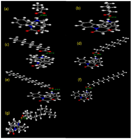 The hydrogen bond of the Str ion-pair compounds was also confirmed by molecular docking. As shown in Figure 5a–g, the hydrogen bond of the Str ion-pair compounds formed between the Str and all the selected fatty acids. In detail, the formation of deprotonated acid anions (RCOO−) and the protonated Str cation (+HNR) was due to the proton transfer between the -COOH of the fatty acids and the N19 of the Str.