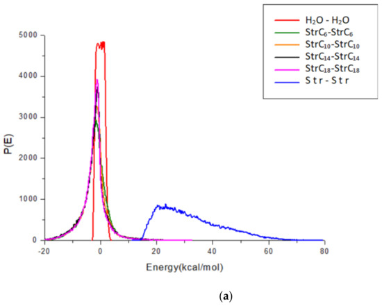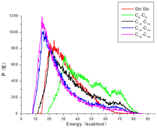 The Str and fatty acids were set to a base role (Ebb) and a screen role (Ess), respectively. Among these fatty acids, it was found that Capric acid (C10) had the best compatibility with Str, as shown in Figure 6. Water and the intercellular lipid were both set to a base screen role (Ebb), whereas the Str and Str ion-pair compounds were set to a screen role (Ess). As shown in Figure 7, the binding energy curve of the Str ion-pair compounds clearly changed, and their curves became more similar to the curves of the water and the intercellular lipid. When the binding energy curve of two substances is more similar, the compatibility of these substances is better [15]. Therefore, it was concluded that Str ion-pair compounds had better compatibility with the intercellular lipid and water than Str.