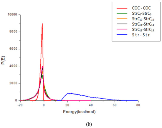 The binding energy distributions curves of (a) water and (b) ceramide, cholesterol and free fatty acid of equal molar ratios (COC) with Str and Str ion-pair compounds.