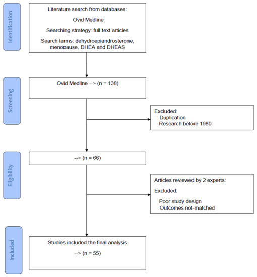 The current review was modeled according to the Preferred Reporting Items for Systematic Reviews and Meta-Analyses (PRISMA) statement (registration number: 10.17605/OSF.IO/SJNXZ at the website: https://osf.io/search/?q=SJNXZ&page=1, accessed on 22 December 2021). In the current review, all the reference articles were retrieved from the database Ovid Medline by using the search terms “dehydroepiandrosterone”, “menopause”, “DHEA”, and “DHEAS” for the topic. Only full-text articles were considered for further screening and inclusion. Using the database Ovid Medline up to 31 July 2021, we conducted a literature search as to identify potential articles in the database. Research before 1980 and duplication articles were excluded during the screening process. After initial evaluation, two experts in the field independently inspected and evaluated potentially eligible studies for exclusion and inclusion. Articles with poor study design or those with unmatched outcomes were deemed ineligible for the study. During the period of paper selection, disagreements between the two reviewers were resolved by mutual discussion until a consensus was reached.