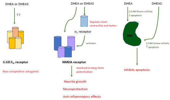 Although these aforementioned hormones are mainly produced by the adrenal cortex and the gonads, they can also be synthesized de novo in the brain, and serve as precursors for androgenic and estrogenic steroids. In the brain, both DHEA and DHEAS can act as neurosteroids, which combine with neurotransmitter receptors involved in learning and memory, such as γ-aminobutyric acid type A (GABAA) receptor, N-methyl-D-aspartate (NMDA) receptor, and the sigma-1 receptor (σ1) [19] (Figure 3). They act as noncompetitive antagonists when combining with the GABAA receptor, but agonists when combining with the σ1 receptor [5,20], which subsequently activates the NMDA receptors [21], a key factor involved in the development of long-term potentiation. By directly stimulating the NMDA receptor, DHEA is able to influence neurite growth and provide neuroprotective and anti-inflammatory effects within the brain [3,21,22]. DHEAS affects sigma receptors, which are thought to be important functional modulators of glutamatergic activity in the hippocampus [5]. The σ1 receptor is expressed in the heart, and it contains a steroid-binding component, which works alongside DHEA. It is believed that the σ1 receptor interacts with ionic channels and calcium influx in the heart, thus regulating the cardiac contractility and rhythm. Likewise, DHEAS has the same negative chronotropic effect on cardiomyocytes, but shows delayed response compared to DHEA [20] (Figure 3).