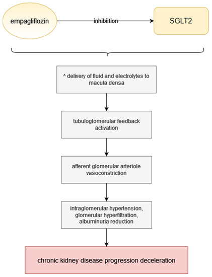Empagliflozin has glucuretic, diuretic and natriuretic properties, which means that through SGLT inhibition, it decreases blood glucose, causes osmotic diuresis and reduces sodium load [29,30]. Approximately 80 g of glucose is excreted every day due to SGLT2 inhibition if the patient maintains normal renal functions [31]. As SGLT2-inhibitors work in the proximal tubules, they increase the delivery of fluid and electrolytes to the macula densa, which activates tubuloglomerular feedback leading to afferent glomerular arteriole vasoconstriction [32,33]. This results in a reduction in intraglomerular hypertension, diminishes glomerular hyperfiltration, attenuates albuminuria and thereby decelerates the progression of diabetic as well as non-diabetic chronic kidney disease (Figure 1) [34,35]. Although a decrease in eGFR may be initially observed during empagliflozin treatment, it is followed by stabilization after a longer period of time [29,36]. Empagliflozin treatment is associated with many beneficial effects, such as weight loss despite increased food intake, largely due to body fat loss, improvement of endothelial dysfunction and arterial stiffness, reduction in blood pressure in diabetic patients and alleviation of the early signs of nephropathy in diabetic animal models; on the other hand, empagliflozin preserved body weight in models of type 1 diabetes [29,31]. Patients with type 2 diabetes were observed to have lost weight and reduced their blood pressure, as well as improved glycemic control after undergoing empagliflozin treatment in monotherapy or as an addition to other medication [27,29]. Other parameters empagliflozin affects positively are HbA1c, waist circumference and uric acid; however, there is no known impact on heart rate or LDL and HDL cholesterol [29].
