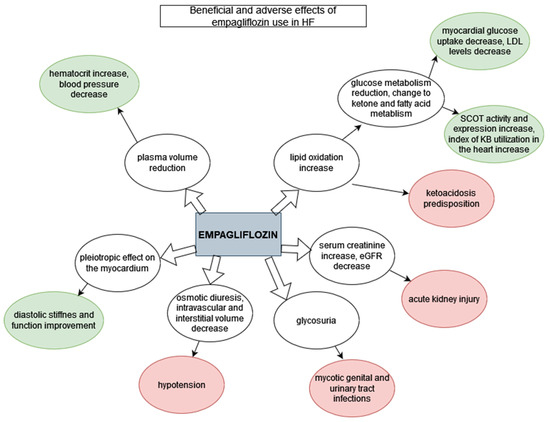 Beneficial and adverse effects of empagliflozin use in HF. Green: beneficial effects; red: adverse effects.