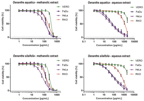 Methanolic extracts exerted significant anticancer potential showing SI between 1.62 and 3.40, with HeLa cells being the most sensitive, especially to O. silaifolia methanolic extract (OS-M), which showed CC50 of 74.24 µg/mL. Moreover, the OS-M showed the highest toxicity (CC50 135.8 µg/mL) towards RKO amongst all tested extracts. Interestingly, not only were the CC50 values obtained for the OS-M on FaDu and RKO cells comparable (Table 5), but also the dose response curves (Figure 1) were similar. Noticeable anticancer activity and selectivity was found for aqueous extracts from O. aquatica (OA-A) and O. silaifolia (OS-A) on FaDu and HeLa cells, with both cell lines being equally sensitive, as can be concluded from similar dose-response curves (Figure 1) and CC50 values (Table 5). The highest anticancer activity and selectivity was found for OA-A on FaDu and HeLa cells with CC50 values of 57.36 (SI > 17.43) and 47.16 µg/mL (SI > 21.2), respectively.