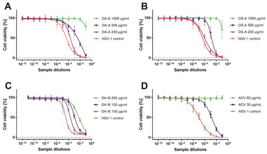 The antiviral activity of O. aquatica and O. silaifolia extracts was tested on HSV-1 infected VERO cells. Based on the dose-response curves presented in Figure 1, we have selected the highest non-toxic concentrations of OS-M, OA-M to be 150 and 200 µg/mL, and for both aqueous extracts to be 1000 µg/mL. The microscopic observations of the cytopathic effect formation in extract treated HSV-1 infected cells in comparison with untreated infected cells (virus control) showed that in case of both aqueous extracts, the CPE was inhibited, suggesting a potential antiviral effect. The inhibition of CPE formation by OS-A at 1000 µg/mL was presented on Figure 2. Also, O. aquatica methanolic extract showed noticeable inhibition of CPE, but not as potent as aqueous extract. Acyclovir was used as a standard antiviral reference substance and completely inhibited CPE formation at 60 µg/mL (Figure 2), whereas a lower dose of 30 µg/mL only partially inhibited the development of CPE.