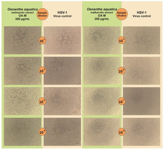 To evaluate the infectious titer of HSV-1 in collected samples, the end-point titration assay was used and the results are presented in Table 6. The O. aquatica methanolic extract showed dose-response antiviral activity (Figure 3C) with the highest decrease of HSV-1 titer (Δlog) of 2.29 at 200 µg/mL (Table 6). Figure 4 shows the end-point HSV-1 titration assay of sample collected from infected VERO cells treated with O. aquatica methanolic extract (200 µg/mL) in comparison with the corresponding virus control, confirming the reduction of the infectious titer of HSV-1. In case of O. silaifolia, the methanolic extract showed only minor reduction of the virus titer. The acyclovir at 60 µg/mL completely abolished the infectivity of HSV-1 (Figure 3D), whereas the concentration of 30 µg/mL reduced the viral titer by 2.05 log (logCCID50/mL) (Table 6). Both aqueous extracts exerted potent reduction of HSV-1 titer at 1000 µg/mL and despite the fact that the accurate amount of viral titer was not calculated (Figure 3A,B), the decrease of the virus titer was no less than 3 log (logCCID50/mL). Since a Δlog of at least 3 is required to regard a substance to possess significant antiviral activity, it can be concluded that both aqueous extracts can be classified as such. Herein, the authors would like to point out that the reported antiviral activity of O. aquatica and O. silaifolia aqueous extracts was observed at relatively high concentration which might be deemed too high for any practical application. However, if future studies allow for separation of bioactive sub-fractions with higher antiviral activity or isolation of compounds responsible for the observed activity, it would greatly benefit the knowledge of natural product derived antivirals. It is still worth mentioning, that this work is the first one to describe anti-HSV activity of O. aquatica and O. silaifolia.
