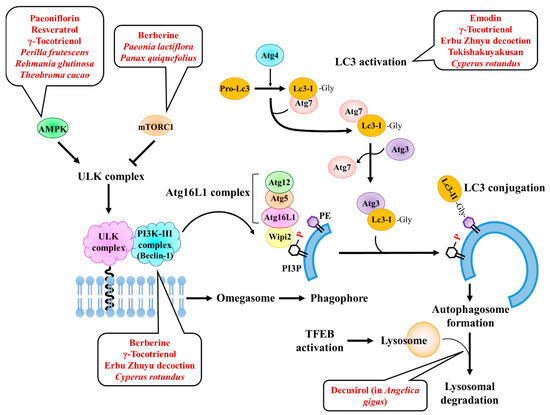 | Paeonia lactiflora | Paeoniflorin | Induces autophagy via inhibition of AKT/mTOR | [114,225,230] |