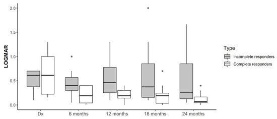 | Incomplete responders to ranibizumab (n = 7) | 0.51 ± 0.23; (0.10–0.70) | 0.46 ± 0.29; (0.05–1.00) | 0.55 ± 0.43; (0.10–1.30) | 0.64 ± 0.68; (0.10–2.00) | 0.55 ± 0.62; (0.04–1.66) |