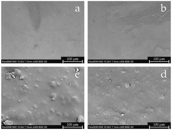 SEM pictures of filaments’ surfaces: (a) PAR, (b) PAR + M, (c) DOM, (d) DOM + M (magnification 300×).