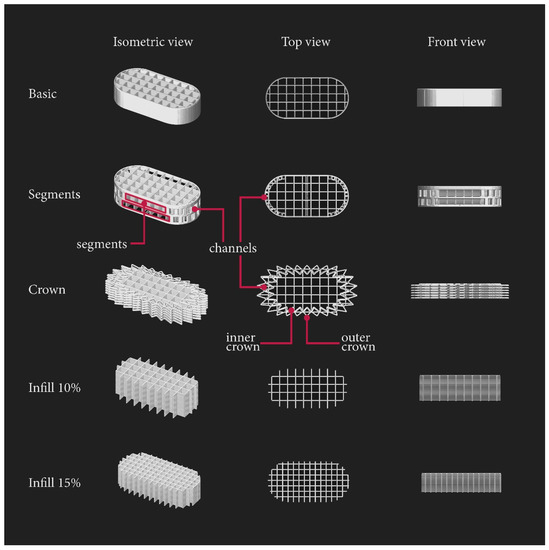 - Crown—tablet based on two-layers parts of 10% rectilinear infill surrounded by crown-shaped rings, with two different sizes, printed alternately: the first two layers bigger (outer crown), then smaller (inner crown), etc.;