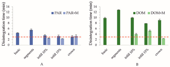 From the graphs presented in Figure 3, we can note that the addition of mannitol led to a decrease in disintegration time for PAR + M tablets with infill 10% and 15% (disintegration times 2 min 34 s ± 5 s and 2 min 22 s ± 2 s, respectively). In the case of tablets made of DOM + M filament, there was an acceleration of disintegration for all tested tablet shapes, with the crown shape disintegrating within 2 min 25 s ± 1 s, thus fulfilling the pharmacopeial limit of 3 min.