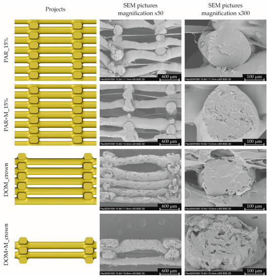 In order to compare the degree of mapping of the tablet structure, we compared the tablets designs with pictures obtained by scanning electron microscopy. The analysis was performed for the formulations characterized by the shortest disintegration time and for the corresponding tablets without mannitol, i.e., PAR_15%, PAR + M_15%, DOM_crown, and DOM + M_crown.
