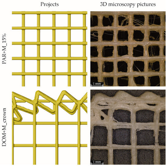 For the formulations characterized by the fastest disintegration (PAR + M_15% and DOM + M_crown), we also compared the designs with the top views obtained from 3D microscopy, presented in Figure 5. Similar to the height of the printed paths, the width was also greater than the theoretical one. For the PAR + M_15% tablets, the measured path width was approximately 20% greater, while for tablets made of DOM + M filament—more than two times greater than the set one.