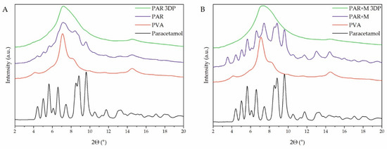XRPD diffractograms of raw paracetamol, PAR (A) and PAR + M (B) filaments, and 3D printed tablets made of PAR (A) and PAR + M (B) filaments.