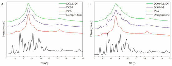 XRPD diffractograms of raw domperidone, DOM (A) and DOM + M (B) filaments, and 3D printed tablets made of DOM (A) and DOM + M (B) filaments.