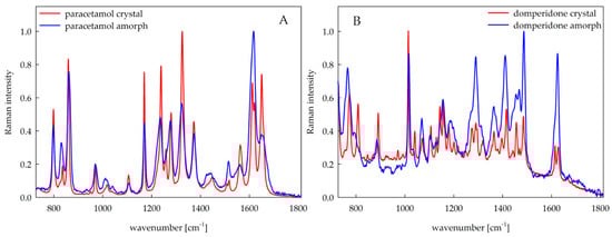 Reference Raman spectra of paracetamol in crystalline and amorphous form (A) and domperidone in crystalline and amorphous form (B).