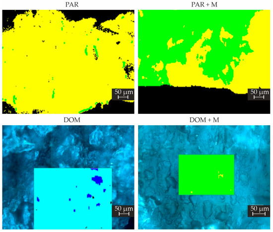 A large predominance of amorphous API was observed in tablets made of PAR filament with a small amount of crystalline form on a few small locations of the tablet. In contrast, both forms of paracetamol were confirmed in the case of tablets composed of PAR + M filament with similar abundance (Figure 9).