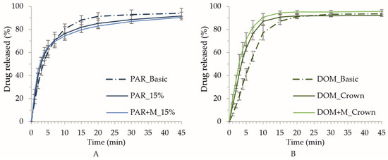 Dissolution profiles of paracetamol (A) and domperidone (B) from 3DP tablets.