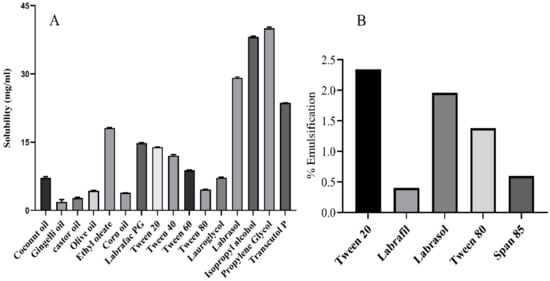 (A) Quercetin solubility in various nanoemulsion components; (B) ethyl oleate emulsification by selected surfactants.