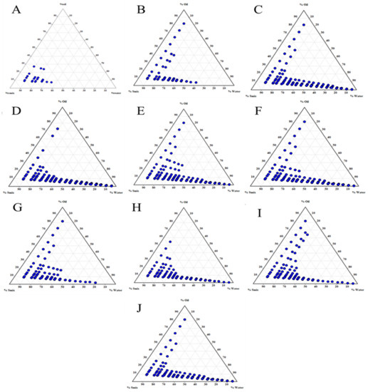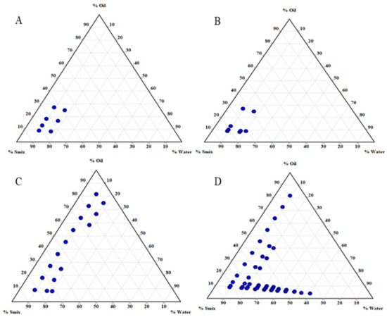 The effect of the Smix mass ratio was assessed further to optimize the NE system (Figure 3). A lower NE region was noted (Figure 3A), in which the T20 surfactant alone (Smix 1:0) was employed, indicating that T20 alone could not reduce the interfacial tension between the oil and water phase, and addition of the cosurfactant was essential. An increase in the NE area was observed with an Smix ratio of 1:1; i.e., in the presence of the LAB cosurfactant (Figure 3B). Increasing the surfactant concentration further; i.e., at Smix 2:1, led to an increase in the NE region (Figure 3C). Smix ratios of 3:1 (Figure 3D) and 4:1 (Figure 3E) also led to a corresponding increase in the NE region, which gradually began decreasing at a Smix ratio of 5:1, signifying that an optimum emulsion was achieved at Smix 4:1. Correspondingly, when the concentration of cosurfactant was increased, while keeping the surfactant concentration constant at 1:2 (Figure 3G), an increase in the NE region was observed compared to Smix at a 1:1 ratio. When the Smix ratio was further increased to 1:3, a slight decrease in the NE region was observed. Correspondingly, an increase in the NE region was seen at Smix 1:4. However, a further increase in the Smix ratio up to 1:5 did not improve the NE region. Primarily, this could be correlated with the HLB value of the Smix combinations. The T20 had an HLB of 16, and the LAB of 12. Overall, the HLB value of the Smix ranged from 14.00 to 16.00 upon an increment in the surfactant concentration, and ranged from 12.80 to 14.00 upon an increment in the cosurfactant concentration. The highest NE region was formed at Smix 1:4 (Figure 3I), indicating that an HLB value of 12.80 would be required to achieve optimum emulsification of EO and produce NE. Secondly, the higher viscosity of T20 could have decreased in the NE region, as high viscosity would negatively affect droplet disruption and result in the breaking of the emulsion. In addition, the NE developed using a phase diagram showing the nanoemulsion region toward the water-rich apex could be diluted to a greater degree [21]. An Smix concentration between 3 and 10% allowed nanoemulsion formation [37]. Hence, in the present study, the concentration of the entire organic phase (including oil, surfactant, and cosurfactant) was maintained at 10% of the total formulation, wherein the oil phase ratio was constant at 1, and the Smix ratio was varied from 5 to 9.