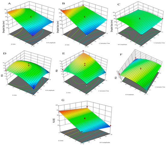 3D Response surface plots representing the interaction effect for the droplet size of Que-NE (A) Smix and % amplitude, (B) Smix and sonication time, and (C) % amplitude and sonication time; the interaction effect for PDI of Que-NE (D) Smix and % amplitude, (E) Smix and sonication time, and (F) % amplitude and sonication time; and the interaction effect for %EE of Que-NE (G) Smix and % amplitude.