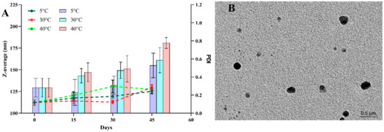 (A) Effect of storage temperature on droplet size (Z-average (nm)) and PDI of Que-NE at 5, 30, and 40 °C for 45 days; (B) TEM image of optimized Que-NE.